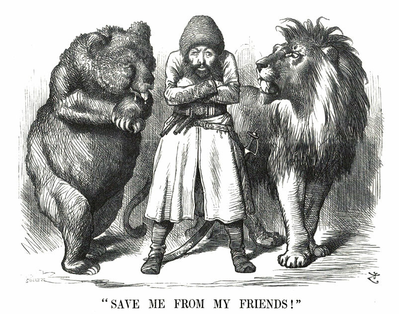 Soon after Lytton arrived in India, he notified Shīr Alī Khan—the third son of Dōst Moḥammad, who succeeded to the throne upon his father’s death—that he was sending a “mission” to Kabul. When the emir refused Lytton permission to enter Afghanistan, Lytton bellicosely declaimed that Afghanistan was but “an earthen pipkin between two metal pots.” He did not, however, take action against the kingdom until 1878, when Russia’s General Stolyetov was admitted to Kabul while Lytton’s envoy, Sir Neville Chamberlain, was turned back at the border by Afghan troops.